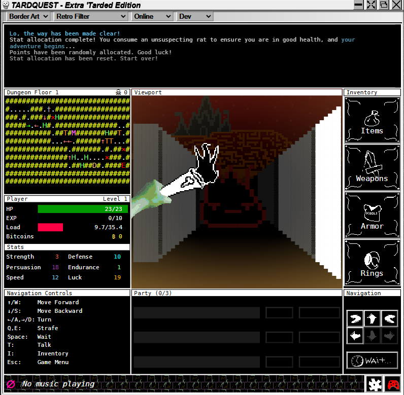 New NPC - Gambler: An equally risky, useful, and mysterious traveller who resides within the depths of this dungeon. Interacting with this trickster will allow you to roll a pair of dice at the cost of 200 BTC. If you roll snake eyes, you will receieve a random stat boost. Anything else will result in nothing. Whether you win, lose, or leave him alone, he will run away never to be seen again... until you find him again on another floor. He will randomly spawn on any floor, ONLY if you have at least 200 BTC in your wallet. (Packard Bell 95)