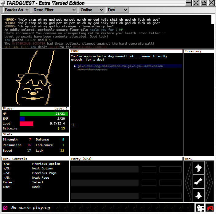 TardQuest now has its very own launcher app! This currently only supports 64-bit Windows systems. Linux support will come later. You can easily select which versions of the game to download, easily uninstall them, check for updates, and view release notes. You can still download Linux and ancient Windows builds outside of the launcher via this page or on the GitHub releases page. All of this is in courtesy of VocaPepper.